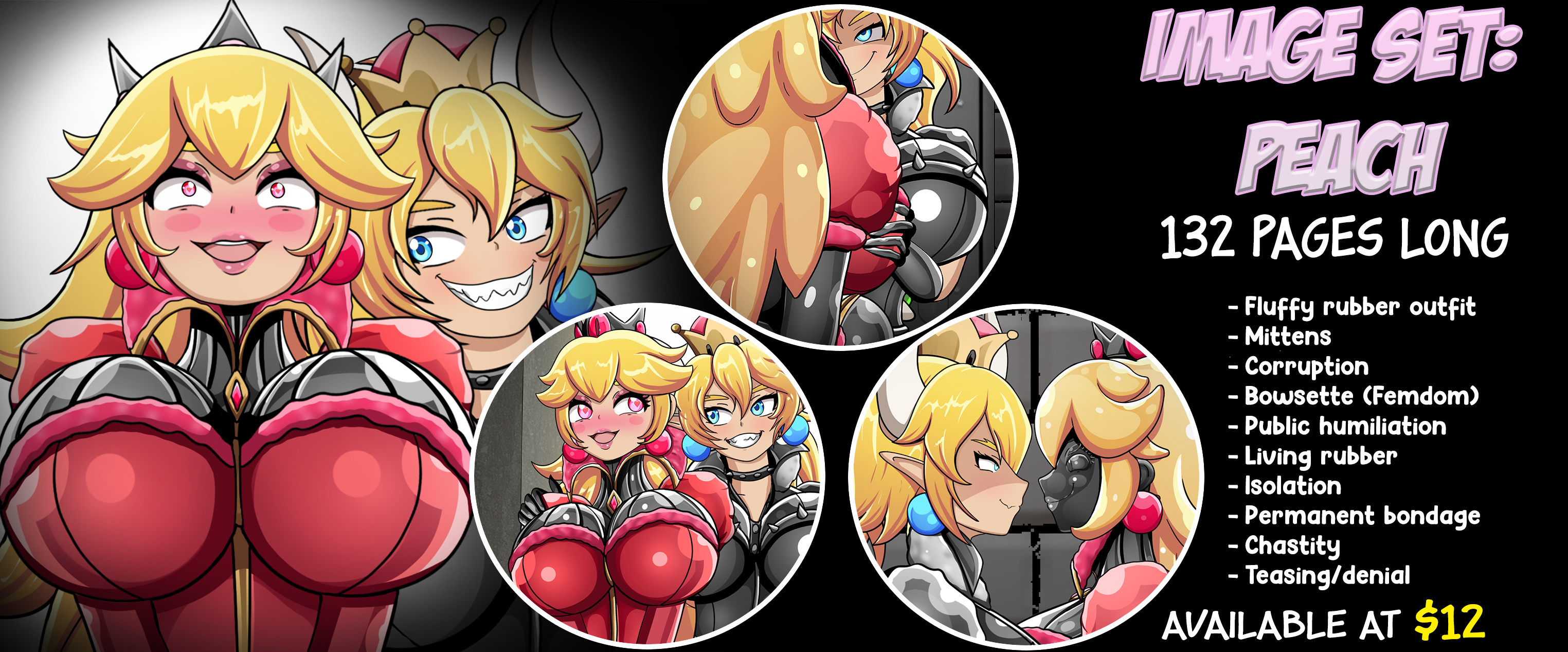 After many years of getting "kidnapped", Peach reveals the truth to her people. That she is a terrible ruler that enjoys being bound and caged. She even used her people's tax money to pay Bowsette to kidnap. Until eventually, Peach decides to surrender to Bowsette completely and offers the Koopa Queen her kingdom in exchange for a life of permanent rubber bondage bliss.